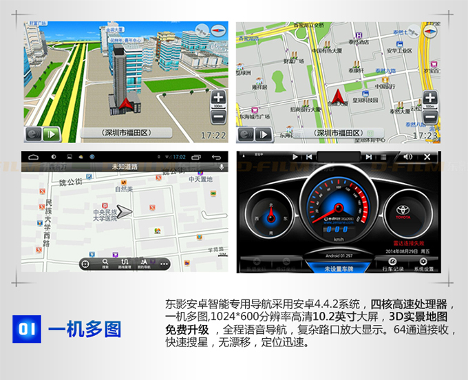 一机多图      东影安卓智能专用导航仪采用安卓4.4.2系统四核高速处理器一机多图1024X600分辨率高清10.2寸大屏,3D实景地图免费升级,全程语音导航,复杂路口放大显示。64通道接收,快速搜星,无漂移,定位迅速。