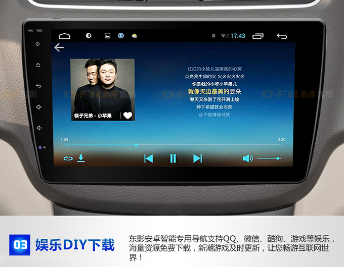 娱乐DIY下载    东影安卓智能专用导航支持QQ微信游戏等娱乐,海量资源免费下载,新潮游戏及时更新,让您畅游互联网世界!