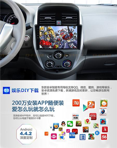 东影2015款阳光专用导航航采用安卓4.4.2系统,四核高速处理器,一机多图,配置安全预警系统,独家电容屏,支持WIFI、手机、3G等多种上网方式,海量资源免费下载,支持1080P HD全格式视频播放。